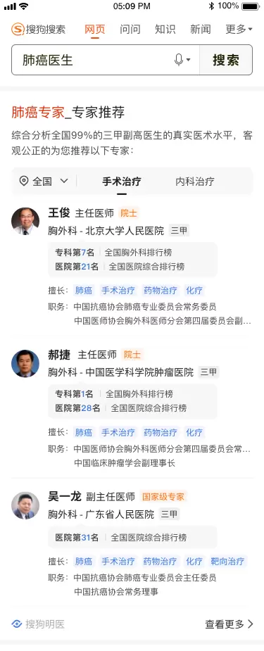 目前,搜狗“专家推荐”首批覆盖17个肿瘤疾病病种,包括国内十大高发恶性肿瘤,以多个维度为标准进行信息匹配。患者可通过该产品查询到在全国、本省、本市范围内擅长该疾病和相应治疗方式的医生专家,在搜狗搜索某个疾病相关的关键词,就会出现相应的专家信息。