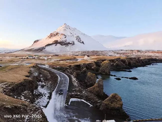 在vivo X60 Pro的镜头下,远处的雪山看起来巍峨耸立,有一种非常壮美的感觉。雄伟的山峰和宁静的海面,动静相宜,在构图方面有种恰到好处的美感。山顶上的皑皑白雪和咖色的土地,在色彩方面形成了鲜明对比,给人带来了一种强烈的视觉冲击。
