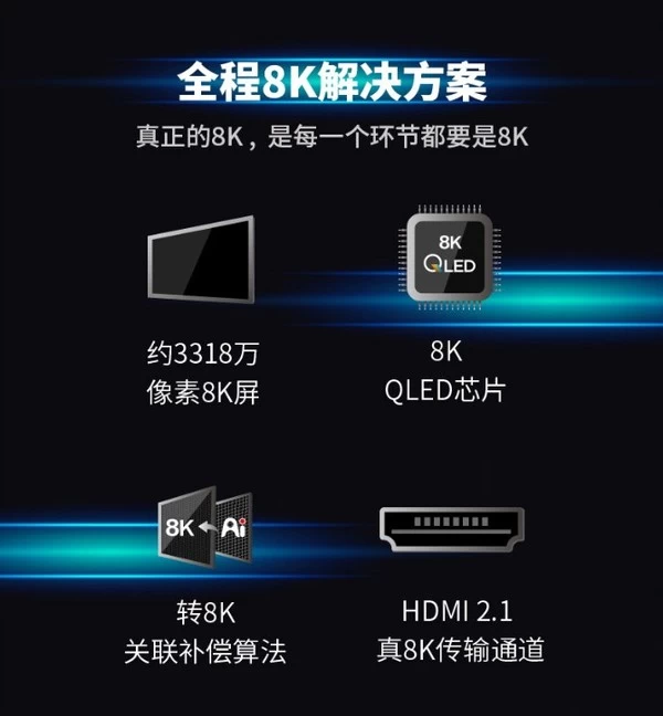 值得一提的是,在8K市场热度不断攀升,各大电视厂商们还在积极布局8K电视赛道时,TCL便已率先推出了TCL X9 8K QLED TV新品。X9 电视在8K上蓄力发展,拥有行业内最为完整的一体化全程8K解决方案:专业8K屏体+8K QLED超级芯片+真正8K传输通道HDMI 2.1+独家AI 转8K关联补偿算法等,全面彰显了TCL的前沿8K科技实力。