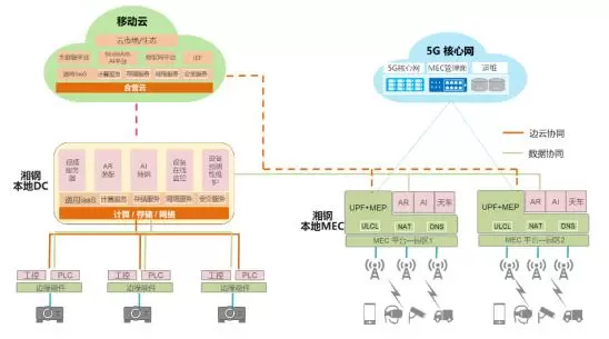 (6)云边协同:由移动云IEF服务和部署在钢铁企业本地的MEC共同构成,可以实现移动云与驻地资源池、MEC的联动。云边协同方案可以将容器化应用从移动云推送到企业驻地MEC,如AI推理算法、容器化企业应用等等,实现云上开发与本地部署无缝衔接、流程闭环。在生产阶段,钢铁企业的生产数据通过5G无线网络传输到驻地MEC,并被部署在MEC的应用实时处理,实现数据不出园区的安全性和低时延。云边协同方案可以充分利用移动云上的服务和工具,与本地部署的5G网络和MEC算力相结合,实现开发、部署的高效性和生产数据的安全性优势叠加。