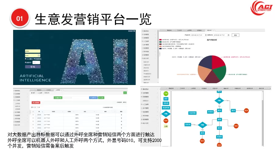 外呼平台,包括人工坐席外呼和智能机器人语音外呼两类。通过中国联通北分等战略合作方提供的外呼平台线路和中继资源支持可实现2000线智能机器人外呼或等量2000人工坐席并发,相对于同时与2000个潜客进行触达和沟通,并且全程语音都会被录音且自动评级。全平台每天可完成超过200万人次的语音触达,极大方便客户的品牌宣传、活动告知以及特别关怀信息提供。
