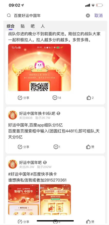 而除了百度APP,在百度贴吧上,战队直接以诸如“好运中国年换卡14战队吧”这样吧名狂掀拉战队朝。即便是“刚创立的战队大家一起积极拉人,拉人越多分的越多,多劳多得”,诸如这样的招募语在百度贴吧俯拾即是。