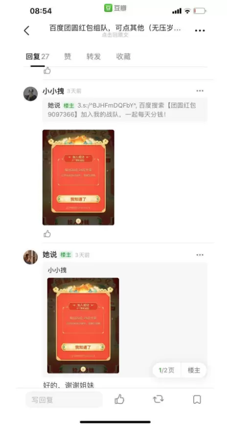 在豆瓣网上,百度团圆红包组队也得到一众“文艺青年”们的热烈参与。“加入我的战队,一起每天分钱”这样的“她说”,同样引得无数网友参与其中。