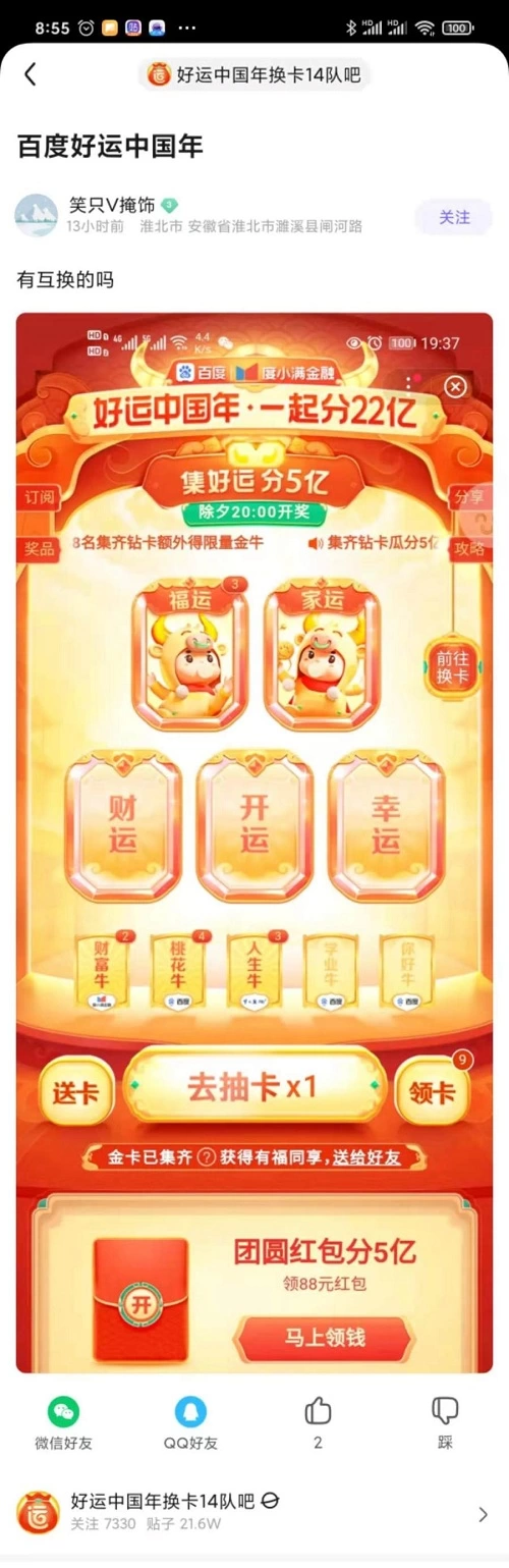 随着2月2日百度正式宣布启动“2021好运中国年”活动。这个持续到2月底的大手笔“云过年”活动,让用户不仅可以通过“集好运卡”瓜分红包,还能通过拉人组战队瓜分5亿元现金红包。