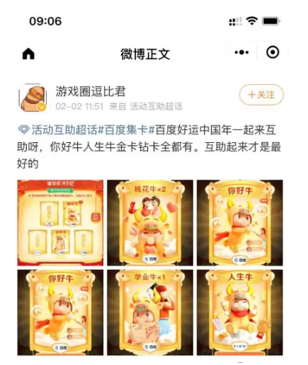 在微博上,百度集卡、百度团圆红包等关键词直接被作为话题为网友转发拉人组队。有网友甚至直接说道“互助起来才是最好的”。而微博作为百度渠道之外的社交平台,网友们在微博上拉战队的狂潮也是一浪高过一浪。