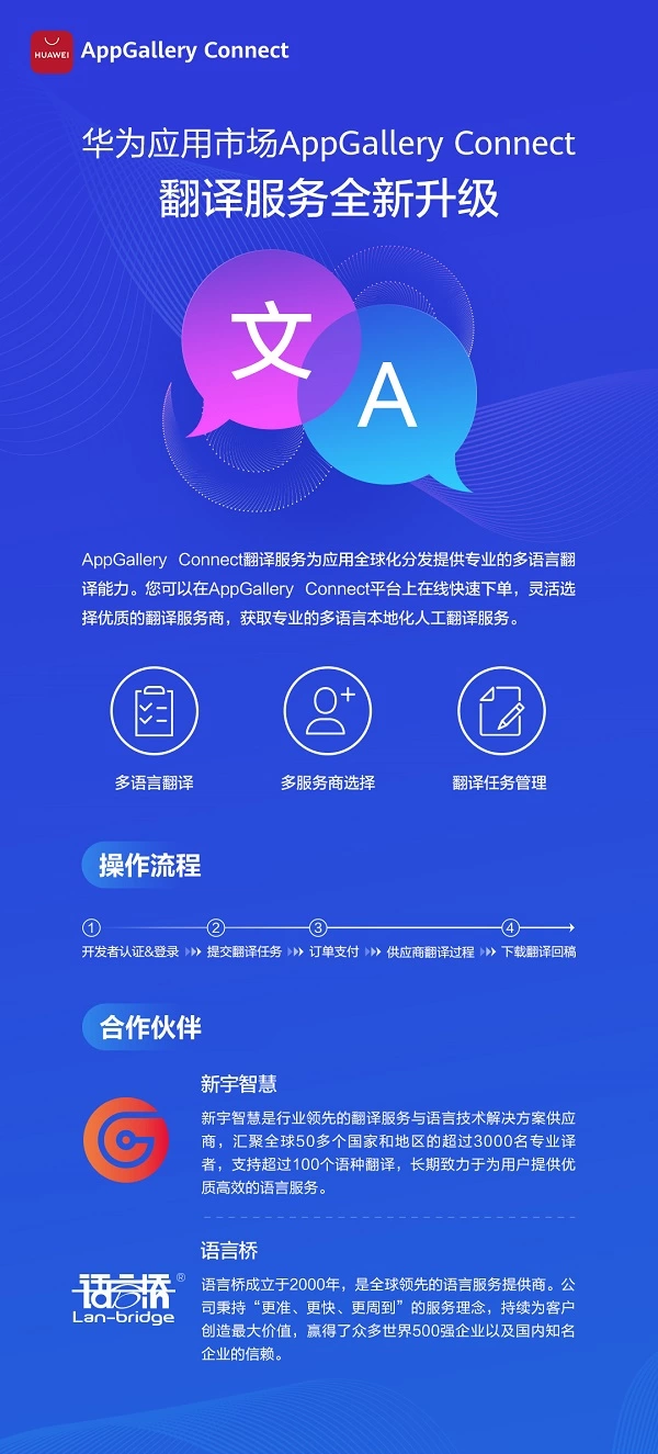 HUAWEI AppGallery Connect翻译服务全新升级,携手新宇智慧、语言桥等多家服务商为全球开发者提供优质的翻译服务,解决应用在全球分发时面临的多语言本地化问题,通过平台化与全环节的翻译资源支持,让应用出海更简单。