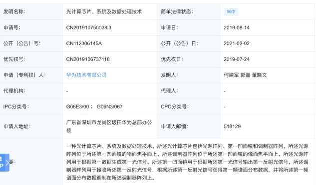 2月2日,华为公布了一份名为“光计算芯片、系统及数据处理技术”的光计算芯片专利。