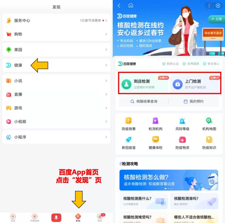 核酸检测如何预约?打开百度App,首页最底部点击“发现”,然后点击“健康”进入百度健康小程序,点击“核酸检测”即可进行核酸检测预约。也可以直接在百度App搜索“核酸检测”。大家可以根据自身需求,选择到店检测或者上门检测。