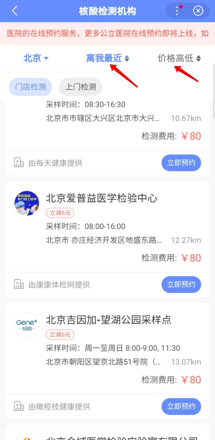 用户点击到店检测后,可按照距离排序,找到距离自己最近的核酸检测地点,轻松找到远近适中、价格合理的核酸检测地点。除专业机构外,近日百度健康还新增全国85个城市的198家公立医院,进一步缓解各地民众面临“预约难”、“排队久”等问题。