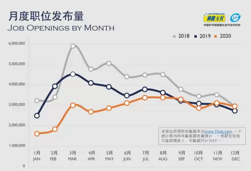 2020年春节前武汉封城、延长假期、商业场所关闭和人群移动限制等,使得几十年来形成的惯例——“节前辞职高峰”、“节后招聘高峰”在2020年并未出现。但及时有效的抗疫手段使得中国成为全球主要经济体中最早恢复社会秩序,企业重启经营的国家,2020年的企业用人需求走出了一条与众不同的曲线。中国权威的人力资源服务商前程无忧(NASDAQ: JOBS)近日对2020全年招聘市场行情进行大数据回顾并推测2021年就业市场相关趋势,发布了《2020职场回顾&2021前景推测报告》(以下简称《报告》)。