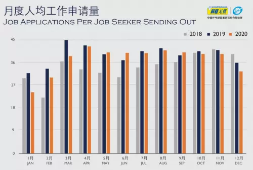 经历了一段“不得不在家“后,求职者开始活跃。2月份在51JOB上申请工作(投递出简历)的人比2019年减少了44%,平均每人发送简历38次,2019年同期为45份。至2020年4月局面已经明显改观。4月、6月和10月,求职者人均发出简历42次、40次和41次,超过了2019年同期的水平,同时2020年中有6个月的人均简历投递量超过了2018年。