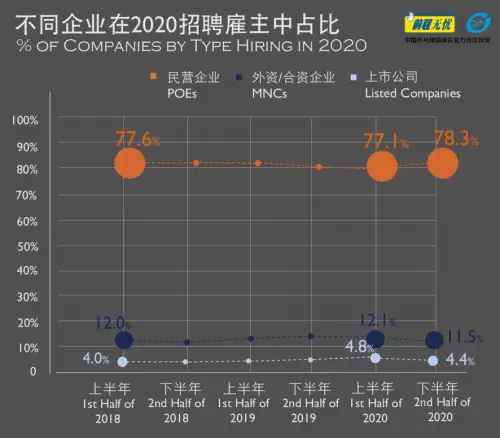 由于个人流动受限,过往的海外消费转入国内市场,特别是疫情的常态化,促使企业加速将线下业务转向在线。民营企业的敏捷性远远超过跨国公司和国有企业,加上海外订单的增加等因素,民营企业在人才招聘上保持了较高的需求,特别是在2020年下半年,人才招聘量已经超过了2019年的同期。