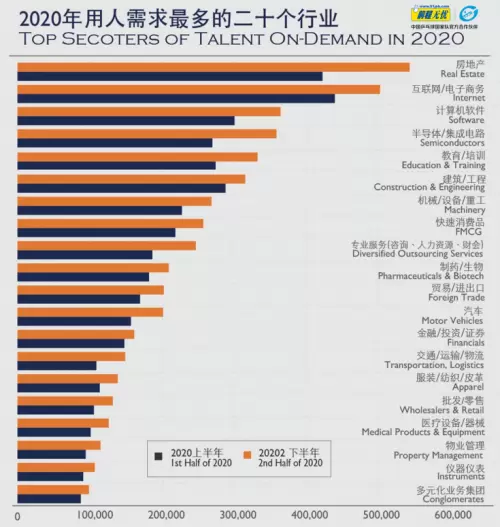 房地产和建筑/工程对就业的支撑明显,2021年很可能继续。2020年由于在线消费者中新增了大量五十岁以上的顾客,原来的海外消费转入了国内,消费对经济和信心提振作用明显,不少原来面向企业的产品和服务也开始转向个人消费者。2021年健康医疗、农林牧渔、专业服务和检测认证等行业将有较大的用人增长,软件开发、半导体和教育培训等会面临较多的并购整合。