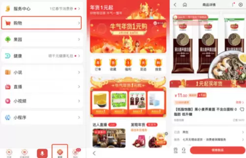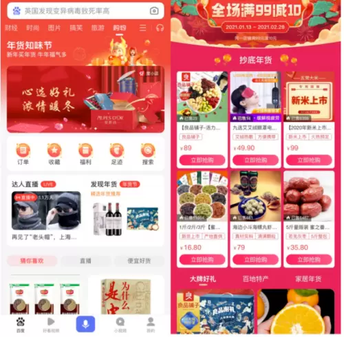 今年的年货节明显热闹许多,除了天猫、京东、苏宁这类传统电商企业,百度、快手、抖音等平台也纷纷加入。从上个月起,百度App就启动了年货节活动,并上线“1元购”秒杀活动……在百度App搜索框下面,人们可以看到醒目的“购物”频道。