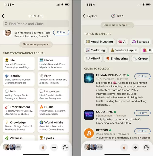 Clubhouse功能上是一个语音聊天室社区,不支持视频或者文字,也不支持录音回放。聊天室可以是公开的,也可以是私密的。聊天室内有主持人和嘉宾聊天,公开聊天室最多可以容纳5000名听众,主持人决定谁来发言,也可以选择“举手”的观众加入群聊。用户可以关注自己喜欢的用户,上面的名人已经有上百万粉丝了。