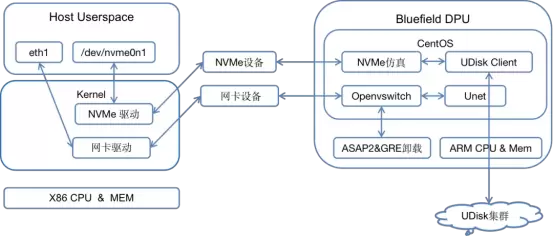 存储方面,通过控制面仿真NVMe设备,数据面借助ASIC芯片高速转发,并通过UDisk基于 RoCEv2无损网络连接后端分布式存储集群,为裸金属物理机接入灵活可扩展的RSSD云盘服务。经测试,裸金属云盘可以达到约40万IOPS的高吞吐,真正实现灵活性与性能的兼顾。