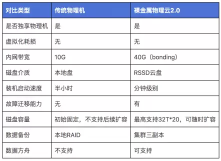 由以上对比表可见,裸金物理云与传统物理机一样,都是独享物理机且无虚拟化耗损。传统物理机的问题十分明显:首先,传统物理机从控制台申请到装机完成动辄需要半小时,致使业务扩容效率不高;其次,内网带宽只有10G,导致诸如大数据等高网络并发的业务经常会面临网络性能瓶颈;本地磁盘不支持后续扩容,导致业务若有扩容需求只能新建服务器;在数据备份安全策略上,由于传统物理机依赖于本地RAID,使磁盘故障通常会影响业务,且磁盘数据丢失风险更高。