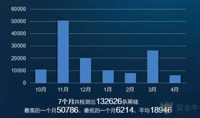 例如使用深度学习进行僵尸网络检测,二分类效果取得了99.7%以的F值,25分类取得了90.3%的F值,在业界处于领先地位。在黑链检测方面,深信服使用自然语言处理与规则相融合的方法,取得了很好的效果:在选取的112位用户中,7个月共检测出132626条黑链,最高的一个月50786,最低的一个月6214,平均18946。