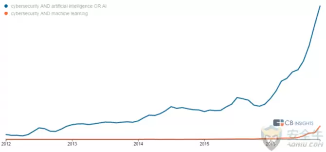 下图为CBInsights给出的人工智能和网络安全的热度曲线。可以看出,从2012年开始,人工智能在网络安全领域就逐渐成为了一个热门的词语,尤其是从2016年开始,以机器学习为代表的人工智能,已经成为这个领域的最热点。