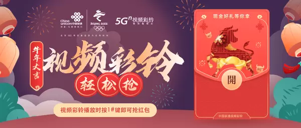 辛丑牛年即将到来,联通视频彩铃携手五月天、王祖蓝、白宇、平安、丁当等18位明星大咖,为广大用户送上牛年新春祝福。为了给广大用户的春节再添喜气,联通视频彩铃将于2月11日大年三十,推出“视频红包轻松抢 千万豪礼任性发”红包活动,用户只要观看视频彩铃并根据提示按下指定数字和“#”井号键,就有机会赢得现金红包、优酷年卡、沃学习大礼包、京东优惠券等千万豪礼,为牛年春节福上加福!
