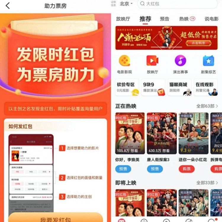 热爱驱动分享,影迷粉丝需要更多支持主创电影的方式。基于此,猫眼智能宣发近期推出了“助力主创红包”通道,方便受众为喜欢的演员加油助威。通过猫眼专业版选择支持的影片及主创支付下单,其他用户即可在猫眼APP、微信猫眼小程序、美团点评电影演出的购票入口看到浮动的“限时红包”标志,点击领取主创红包。