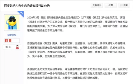 (百度贴吧中“内容生态治理专项”的上线公告)