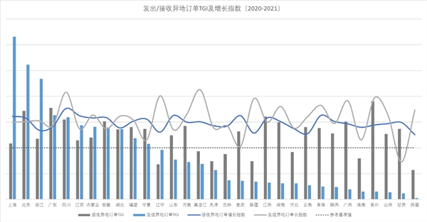 从近日京东大数据研究院发布的《2021年春节·年货节消费趋势报告》显示,在2021年春节来临之际,京东异地订单(用户下单并发往非常用所在地)再次火爆。从接收订单量TGI(相关订单占所有订单的比例)来看,贵州、江西、四川、安徽和广西排名前五,这些正是外出游子们比较多的省份;而从发出订单量TGI来看,上海、北京、浙江、广东、四川排名前列,也是游子们集中的工作地,西南、西北和东北是发送异地订单增幅最大的地区。