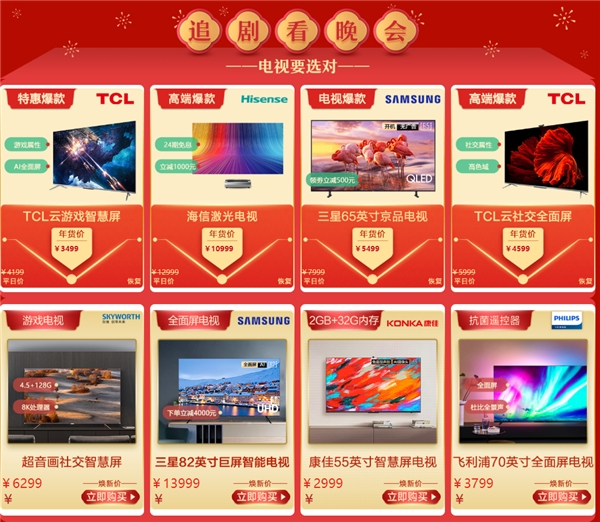 其实不论是为父母选年货还是给自己送礼物,智能家电类产品确实能帮助我们的生活解决很多实际问题,让生活变得更人性、趣味与智能。那些不能回家的原年人,在春节肯定要与父母视频连线共享云上团圆时刻,那一台超高清大屏电视机一定能够体验到更加真切的画面,尤其影院级的视听感受也是帮爸妈提升生活质量的一大妙招。另外过春节怎么能不看春晚、追剧呢!追剧看晚会大屏电视才更爽,不仅画面清晰更能防蓝光更护眼,关键老人操作起来也简单~