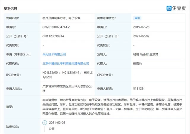 第一项是关于芯片。企查查显示,华为公司公开的这项专利名为“芯片及其制备方法、电子设备”,申请时间为2019年。