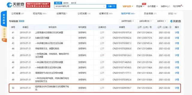 第二项则是关于电池。天眼查显示,华为公司公开的这项专利名为“硅碳复合材料及其制备方法和锂离子电池”。