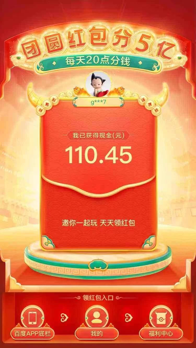 2月11日(除夕)20点,“集好运卡 ”活动正式开奖,除了收到现金红包之外,更有用户收到限定版盲盒,足金金牛等奖品。组队再分5亿“团圆红包”,有用户奖金金额更是高达100多元,这得不说,这个力度恐怕比工作群里老板发的红包还大!百度这波发红包真可谓“诚意十足”!