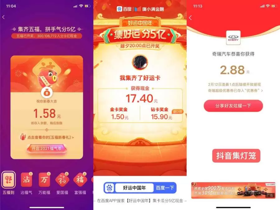 除夕还没过完,百度、抖音、支付宝等互联网大厂的集卡红包就开奖了,支付宝一如往昔的1.58元就快引来一波网友的吐槽,“每年撒钱几个亿,人均最后一块五”。当然也不是每家都跟支付宝似的,小编细细算了一笔账,在百度集好运卡,支付宝集五福,抖音集灯笼活动中,用户能拿到的钱,百度是最高的。