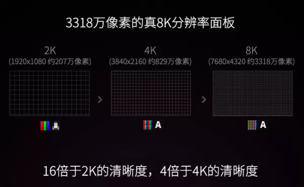 追求更高清晰度是显示行业永恒不变的主题,从标清到高清(FHD)再到超高清(4K/8K),显示行业不断进行技术迭代,带给消费者极致的视听体验。在超高清显示技术中,8K超高清技术备受显示市场和观众青睐,其画质分辨率高达7680×4320,拥有3300万像素,是4K的4倍。