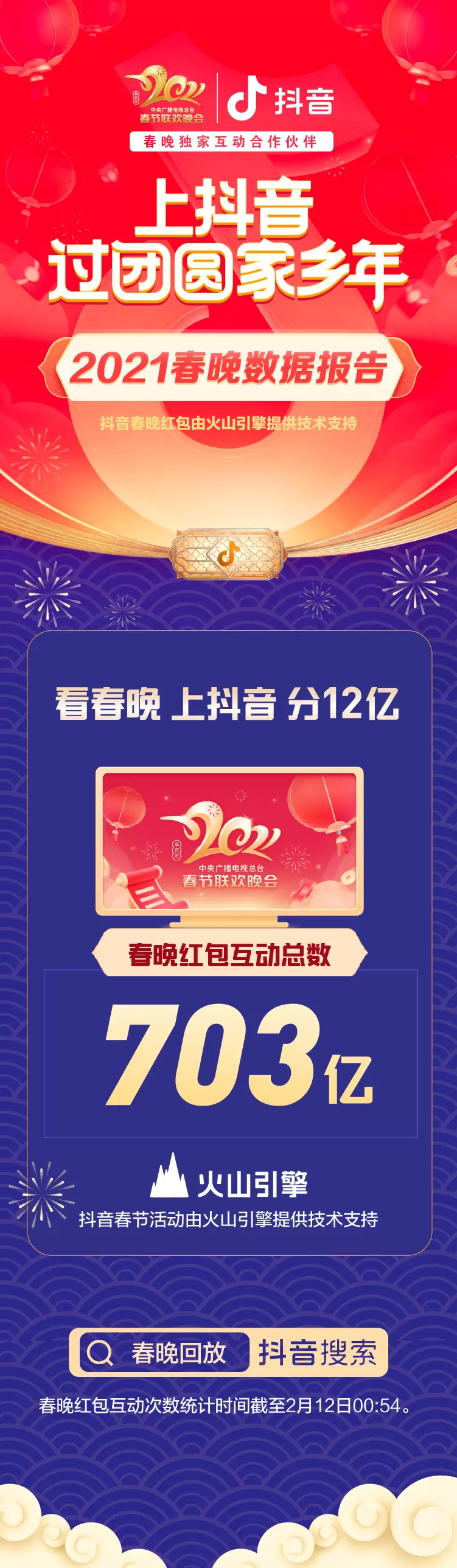 从官宣到除夕夜只有15天,抖音紧急上线的春晚互动系统顺利过关,活动全程流畅稳定。据悉,火山引擎为此次抖音春晚互动提供了技术支持,保障全国观众703亿实时互动的顺利进行。
