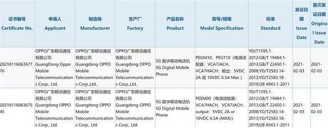 3C认证显示,入网的OPPO 5G手机申请人、制造商、生产厂均为 OPPO 广东移动通信有限公司,首次发证日期为2月3日。而这其中的65W闪充的机型正好与此前数码博主 @数码闲聊站 爆料的OPPO Find X3 Pro的闪充功率一致,所以此次入网的OPPO新机被分析人士推测为就是Find X3 Pro也在清理之中。
