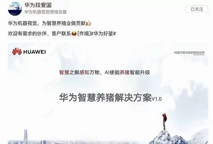 近日,华为机器视觉领域总裁段爱国在网络爆料称,华为机器视觉推出了智慧养猪方案。养殖业的发展方向是数字化、智能化和无人化。