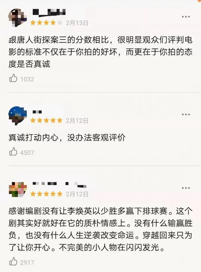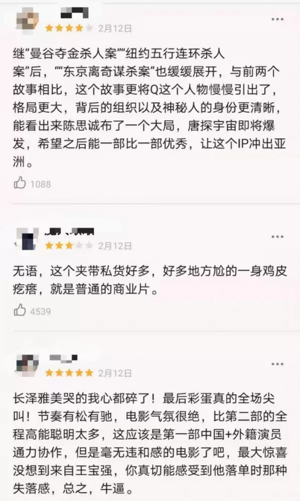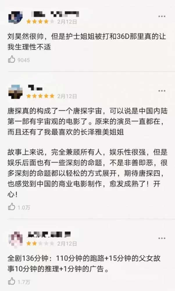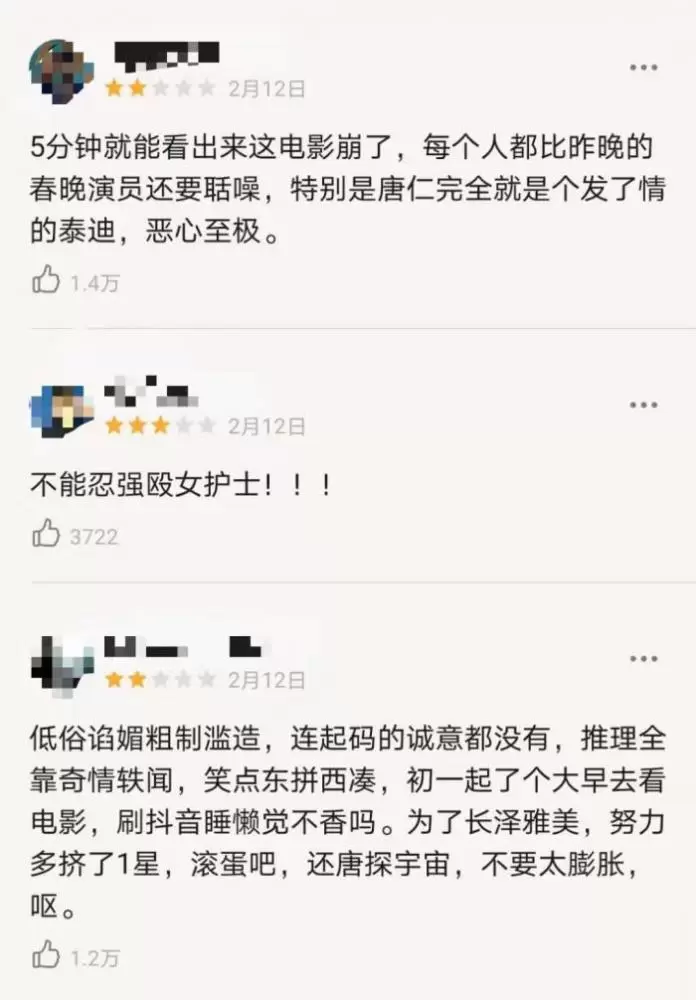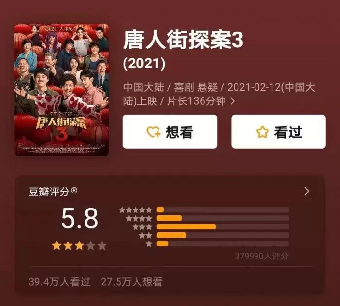 《唐探3》开分6.8,首映当日结束时,低到了6.2分,不禁让人咋舌,甚至有些影迷“断言”:这部比第二部扑得更狠。2月15日,豆瓣评分降至5.8分,在多部春节档电影中垫底;而《你好,李焕英》则以8.2分位居口碑第一。