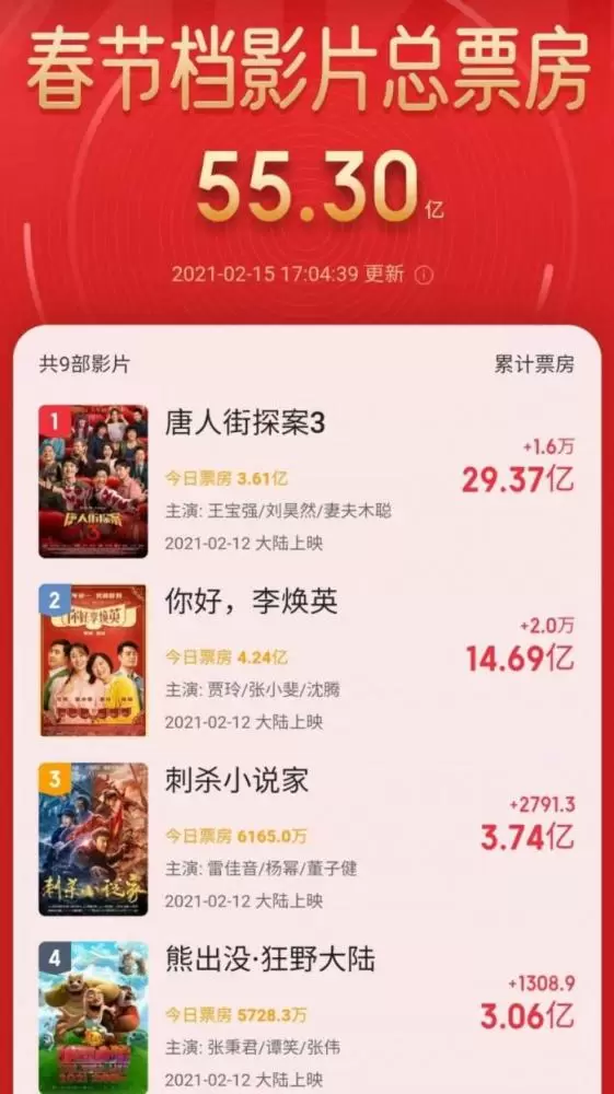 春节档总票房突破55亿元!《你好,李焕英》单日票房反超《唐探3》!