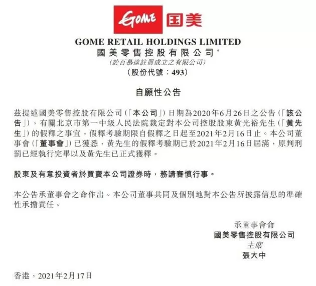 2月17日消息,今日早间,国美零售发布公告称,公司董事会已获悉,黄光裕的假释考验期已于2021年2月16日届满,原判刑罚已经执行完毕以及黄光裕已正式获释。