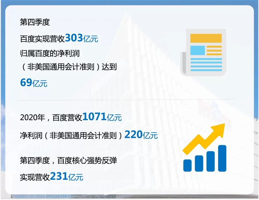 北京时间2月18日,百度发布截至2020年12月31日未经审计的第四季度及全年未经审计财报。财报显示,第四季度,百度实现营收303亿元,归属百度的净利润(非美国通用会计准则)达到69亿元,连续四个季度超市场预期。第四季度,百度核心强势反弹,实现营收231亿元,环比增长8%,远高于历年同期的环比增速表现。
