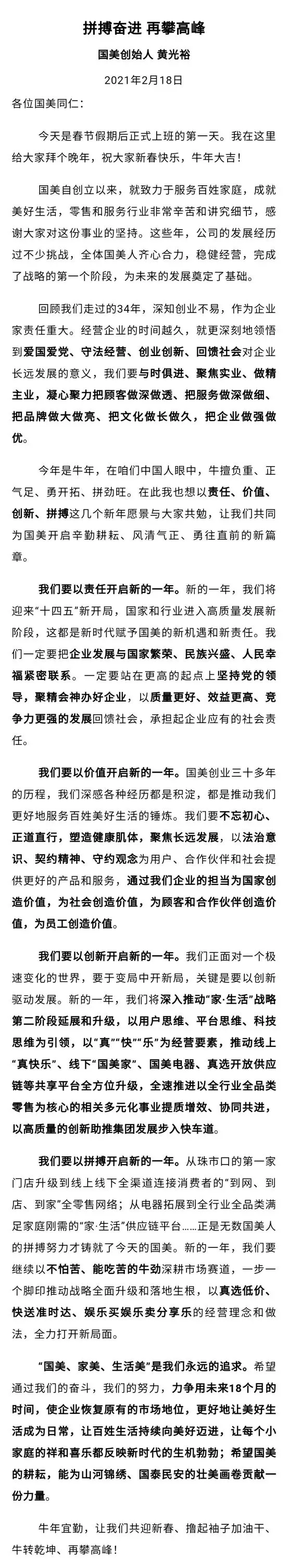 2月18日晚,国美官方微信号刊发黄光裕以国美创始人身份在集团高管会上的讲话。值得注意的是,这是黄光裕获释后首次公开亮相。