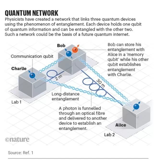 荷兰代尔夫特理工大学的物理学家罗纳德·汉森(Ronald Hanson)与他的合作者利用量子纠缠现象建立了连接三个量子设备的网络。每个设备持有一个量子比特的信息,可以与另外两个发生纠缠。这样的网络可以成为未来量子互联网的基础。