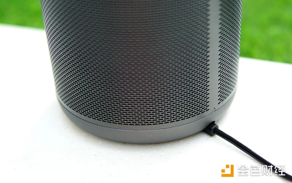 机身没有一个机械按钮,采用全触控操作方式,整个顶面皆为操控区域,在通电后会亮起灯环,颇为漂亮。此外,可以在面板看到6个明显的开孔,它们为小豹区块链AI音箱的麦克风矩阵。