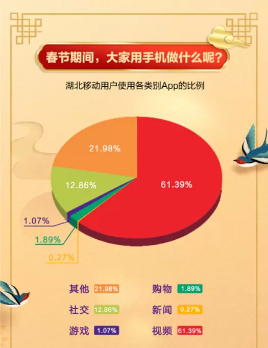 疫情防控常态化后的首个春节,平安与喜庆成为关键词。日前,中国移动湖北公司发布了新春大数据报告。
