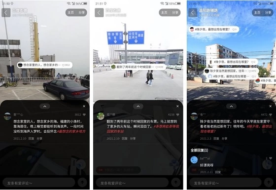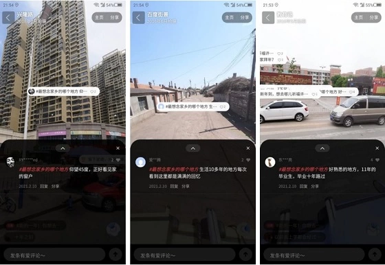 同时,“云回家”还为人们的思念和祝福插上了翅膀,百度地图此次活动中特别设置“话题”功能,用户可以在街景中留言,添加当日热议话题或自由创建话题,例如 #最想念家乡的哪个地方、#除夕夜,最想出现在哪里?等等,与全网用户共话一年来的欢喜与收获,分享关于家乡的故事。出生于杭州的汤唯、出生于齐齐哈尔的沈腾等8位明星也惊喜空降,参与各自家乡的街景话题留言,分享他们对于家乡的回忆。