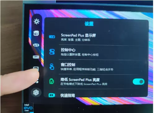 由于ScreenXpert 2是灵耀X双屏的内置软件,因此用户无需专门下载,开机后该软件会以竖排任务栏的形式出现在副屏左侧。该任务栏具有亮度、MyASUS、键盘解锁等的快速访问按钮,可实现不同的功能设定。