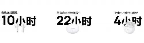 HUAWEI FreeBuds 4i在小巧的机身内加入高能量密度的大容量电池,配合低功耗设计方案,带来长续航表现。充满电后单次音乐播放时长可达10小时,配合充电盒反复使用时长达22小时,让电量时刻在线,随时随地聆听好音乐。充电方面,HUAWEI FreeBuds 4i还支持快充功能,充电10分钟音乐播放可达到4小时,即使前一天晚上忘记充电,利用早上洗漱的时间充电便可满足通勤路上的使用,缓解电量焦虑,让音乐持久相伴。(数据来源于华为实验室)