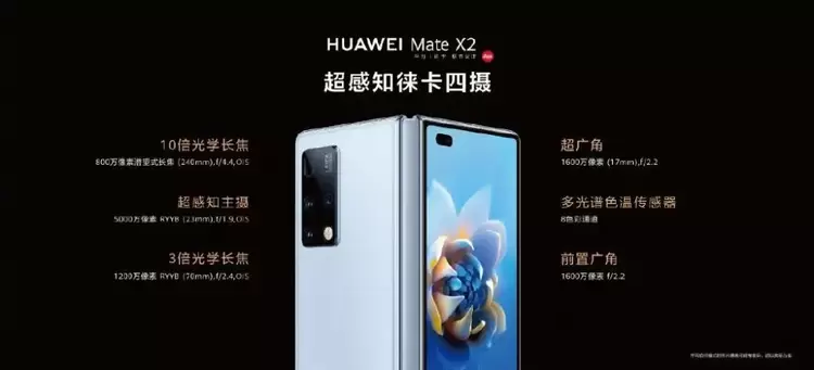 影像部分,华为Mate X2后置超感知徕卡四摄,5000万1/1.28英寸RYYB传感器,3倍光学长焦,10倍光学长焦,100倍双目变焦,2.5cm超级微距,前置1600万广角自拍镜头。