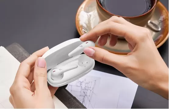 云母白款耳机表面采用了哑光涂层工艺,圆润柔和;钛黑款耳机表面采用了 NVCM 类金属真空镀层工艺,突显时尚金属般硬朗气质;充电盒独配有保护套,贴心保护无惧划痕。