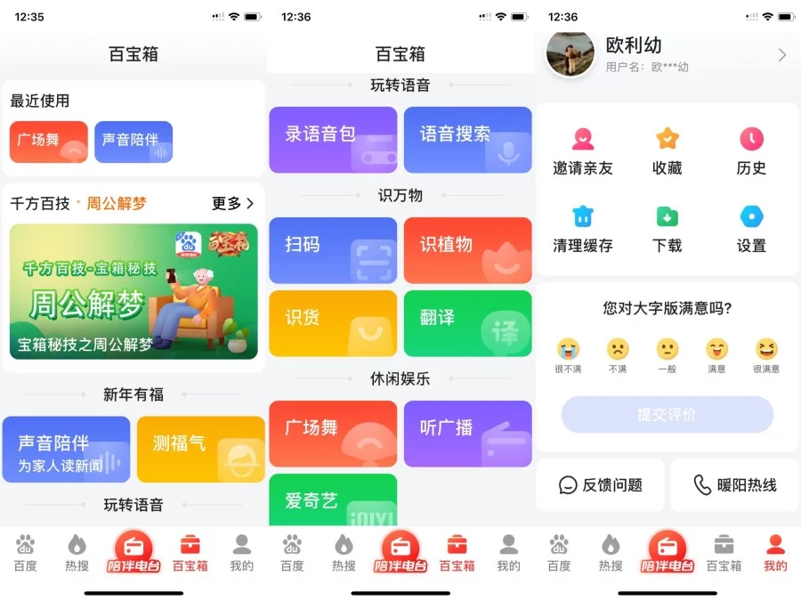值得一提的是,除了“陪伴电台”,围绕“看、听、用”三大场景,百度大字版也专门为老人设置了首页短视频信息流、实用工具集合“百宝箱”等一系列“适老”新功能,让老年人更好地在互联网时代享受科技带来的便利。此外,百度大字版APP还为长辈们特别设置了“暖阳热线”专属服务。长辈如果有不会的问题,拨打暖阳热线,专属客服都能一对一耐心解答。